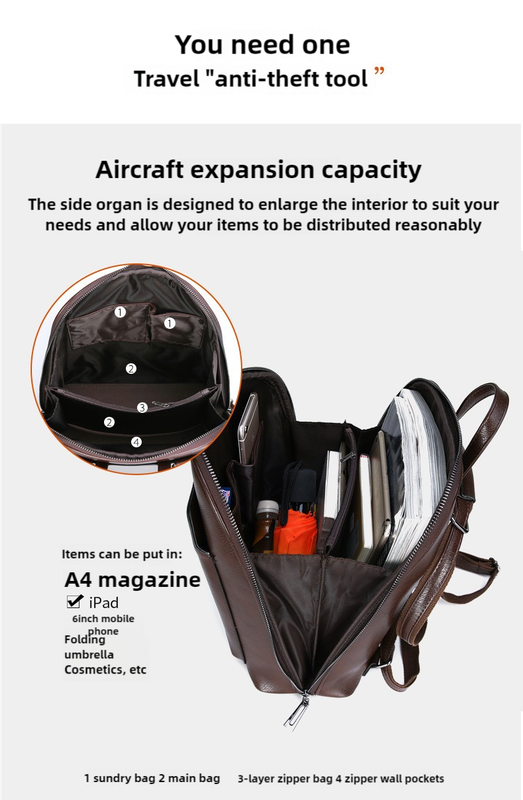 • Capacity: Designed with spacious compartments for A4 magazines, iPad, mobile phones, folding umbrellas, and cosmetics.