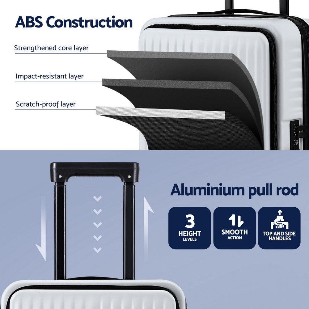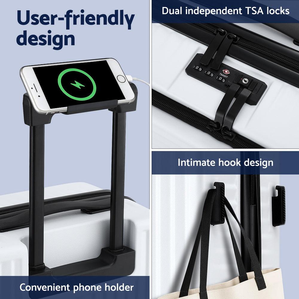 Features 20" carry on front pocket luggage case Quick-access laptop compartment Premium ABS material with durable matte finish Convenient phone holder Dual TSA-approved combination locks Intimate hook design Built-in retractable trolley system Smooth 360�� dual spinner wheels Spacious interior with elastic cross straps Divider panel and multi-functional mesh pockets Top and side carrying handles